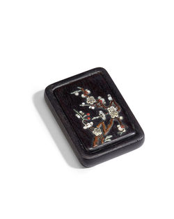 ![]() LYMF-366 紫檀印泥盒 十九世紀 紫檀 高2.3 x 直徑4.5公分 | ![]() LYMF-369 紫檀托盤 十九世紀 紫檀 高4.5 x 寬23 x 長21.2公分 | ![]() LYMF-371 瑪瑙筆洗 十九世紀 瑪瑙和沉香 瑪瑙筆洗: 高7.5 x 寬7.2 x 長4.5公分 沉香底座: 高5 x 寬17 x 長7公分 | ![]() LYMF-381 紫檀嵌百寶硃砂筆舔 十八世紀 紫檀、珍珠母和青金石 高1.6 x 寬6.7 x 長8.6公分 |